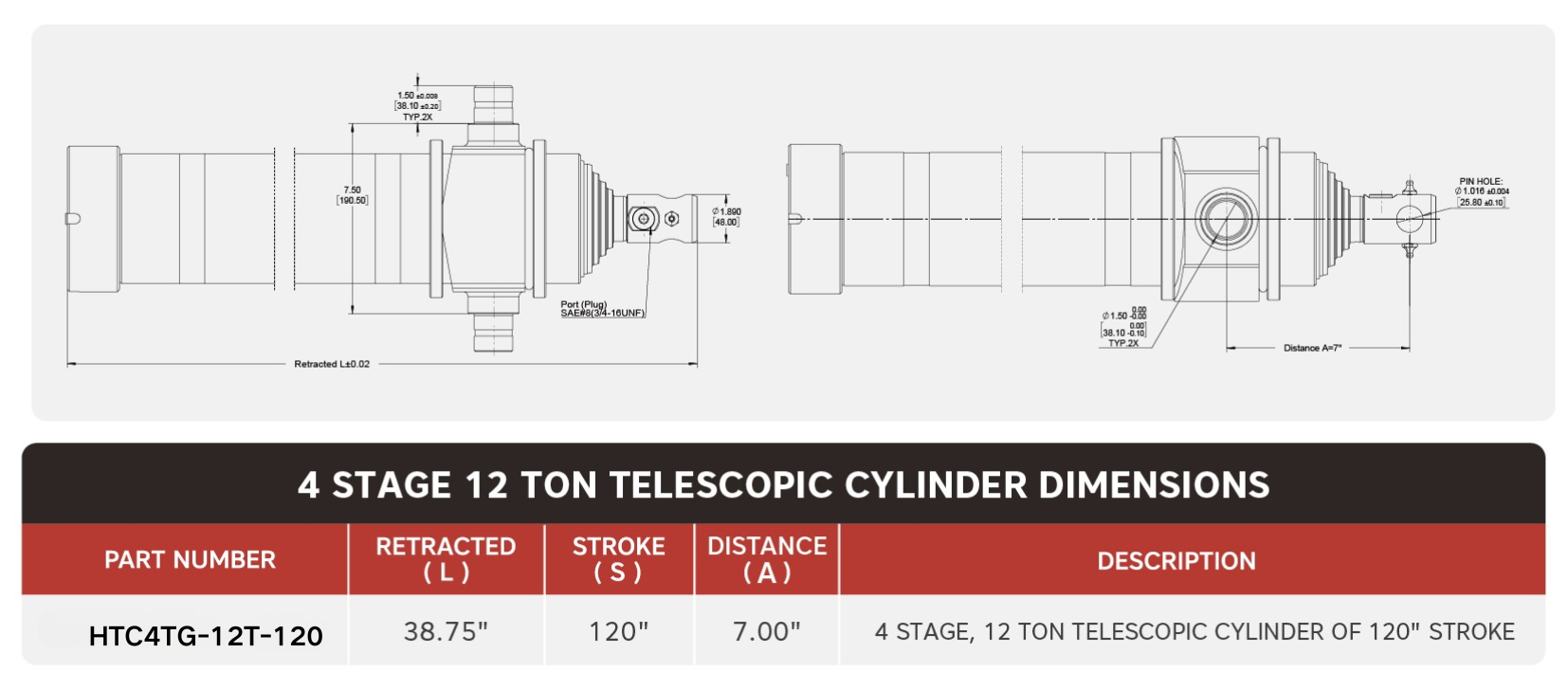 "HTC4TG-12T-120", 4-traps, 12 ton 120" slag telescopische cilinder