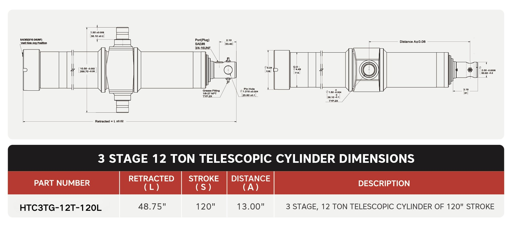 "HTC3TG-12T-120L", 3-traps, 12 ton 120" slag 13" tapafstand telescopische cilinders