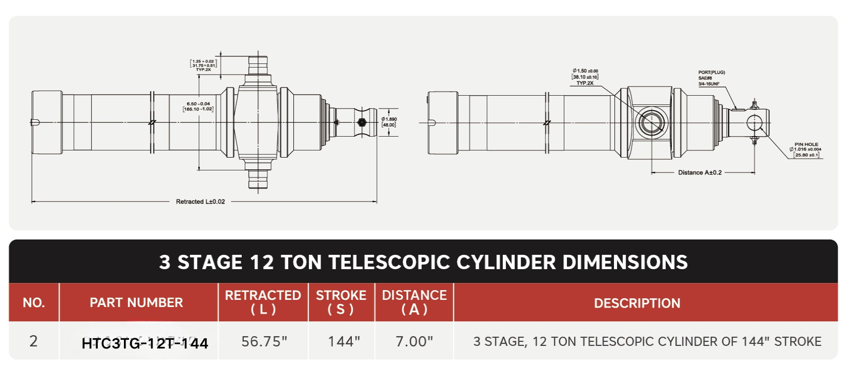 "HTC3TG-12T-144", 3-traps, 12 ton 144" slagtelescopische cilinders