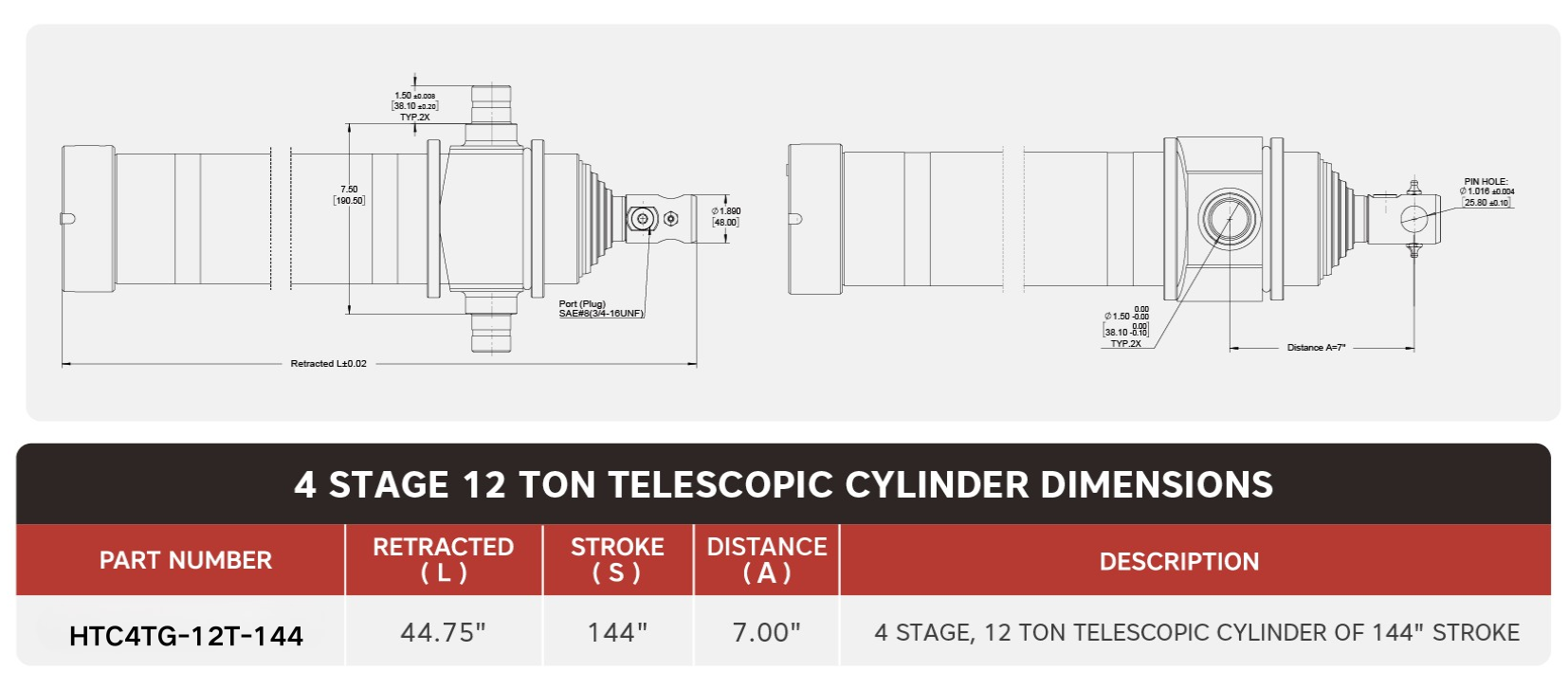 "HTC4TG-12T-144", 4-traps, 12 ton 144" slagtelescopische cilinder