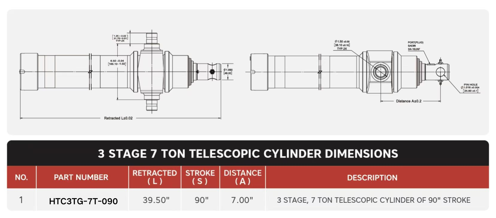 "HTC3TG-7T-090", 3-traps, 7 ton 90" telescopische cilinders